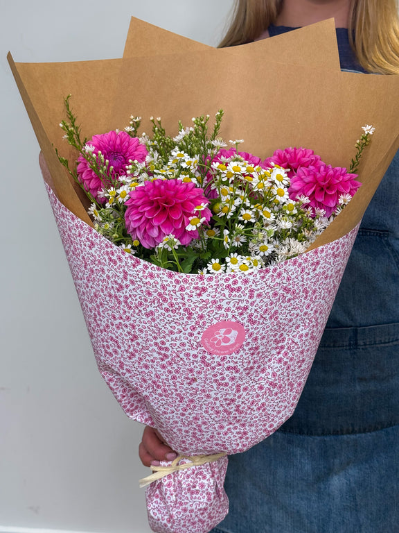 Choose between kraft paper or our special pink posy wrap to suit the occasion, and add a cute little bunny freckleberry chocolate, available with or without for a cheeky Easter touch.