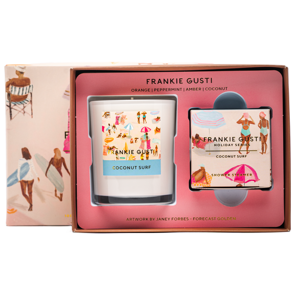 An ode to Australian summers and carefree days spent under salt-streaked skies. Artist Janey Forbes captures the spirit of endless holidays through bold, sun-washed artworks, while Frankie Gusti translates those moments into scent - bright, nostalgic, and deliciously untamed. The perfect gift for someone (or yourself) for an Aussie Christmas.