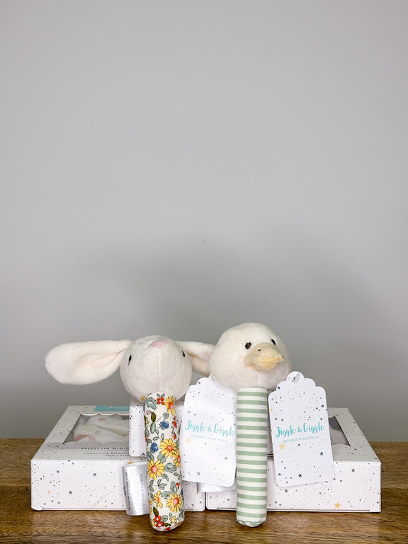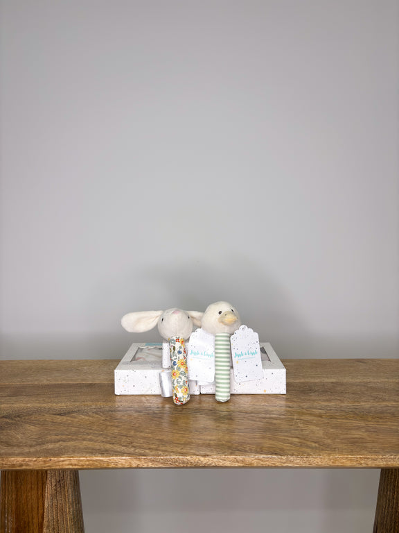 The Plush Hand Rattle Toy is a sweet and soothing first toy for babies, featuring a plush duck/bunny head with embroidered details and a soft rattle sound. The easy-to-grip handle encourages sensory development and coordination in little hands.